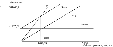 Три главные линии показывают зависимость переменных затрат, постоянных затрат и выручки от объема производства. Критического объема производства показывает объем производства, при котором величина выручки от реализации равна ее полной себестоимости.
