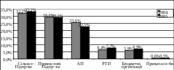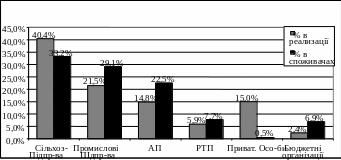 Найбільший обсяг реалізації дають споживачі з першої групи (сільськогосподарські підприємства) – 40,4% від обсягу реалізації (при долі в загальній кількості споживачів 33,2%). Далі йдуть промислові підприємства 21,5% обсягу реалізації при 29,1% від кількості споживачів (рис.2.2).