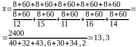 Например, рабочие заготовительного цеха были заняты переработкой сырья в течение 8-часового рабочего дня. Первый рабочий затратил на выпуск продукции 12 мин, второй - 15 мин., третий - 11, четвертый - 16 и пятый - 14 мин. Определите среднее время, необходимое на выпуск продукции.