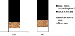 Більш освіченим є міське населення, яке значною мірою поповнюється за рахунок навчальної та післянавчальної міграції сільської молоді. Так, питома вага осіб з вищою (включаючи базову та початкову вищу) освітою серед міського населення становить 37,9% (у 1989 р. - 34,5%), а серед сільського - 17,7% (у 1989 р. - 13,3%). Натомість частка осіб, які не мають навіть повної загальної середньої освіти серед міського населення становить 26,7%, а серед сільського - 47,3% (у 1989 р. - 35,8 % та 60,4% відповідно).