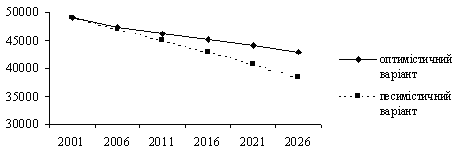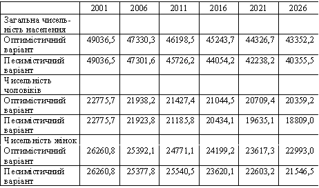 За оптимістичним варіантом прогнозу до 2026 р. загальна чисельність населення України скоротиться до 43,3 млн. осіб, а за песимістичним - до 40,4.