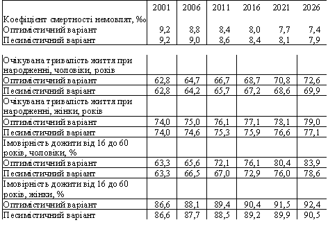 Хвилеподібний характер тенденцій смертності в Україні впродовж принаймні найближчих 25 років, значні резерви зниження смертності у допрацездатних і особливо працездатних вікових групах, адаптація населення до нових соціально-економічних умов, подолання затяжної економічної кризи, успіхи медицини в лікуванні широкого кола захворювань дають підстави розраховувати на зниження ймовірності смерті: прискорене зниження - смертності немовлят (до 7,5-8%) і дітей раннього віку, вельми помірне - жінок 16-60 років (імовірність померти, не доживши до 60 років, для 16-річних дівчат скоротиться до 7-8%) і населення старше 60 років. Найбільші зрушення (як і протягом останніх 50 років) очікуються у смертності чоловіків працездатного віку. Передбачається, що імовірність померти не доживши до 60 років для 16-річних юнаків у 2026 р. становитиме 16-21%. Практично смертність саме цього контингенту визначатиме загальний характер тенденцій смертності та тривалості життя населення України.