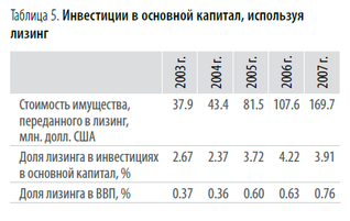 Доля лизинга в ВВП в прошедшем году увеличилась почти в два раза и достигла 3,02% . В объеме средств, инвестированных в основной капитал, лизинг занял 15,5%. Однако, согласно международному опыту, доля лизинга в инвестициях субъектов экономики в основной капитал может достигать 40%, что свидетельствует о хороших перспективах дальнейшего роста российского лизингового рынка.
