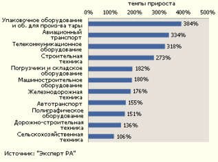 Самым быстрорастущим сегментом в 2007 году стало оборудование для производства тары. Лидеры по темпам роста в 2007 году - сегменты оборудования для производства тары (финансирование "Авангард-Лизингом" строительства завода в Омске), авиационного транспорта (крупные контракты "Ильюшин Финанс Ко", выход в авиасегмент "ВТБ-Лизинг") и телекоммуникационного оборудования. Каждый из этих сегментов вырос более чем в 4 раза. В 3,7 раза увеличился объем сделок с предметами строительной техники, которая пользовалась огромным спросом вследствие значительных объемов строительства в растущей российской экономике6. (Рисунок 6).