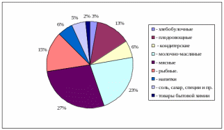 В структуре материальных затрат предприятия наибольший удельный вес занимают затраты на продовольственные товары. В структуре продовольственных товаров наибольшую долю занимают затраты на мясные, молочно-масляные товары, рыбные товары, наименьшую – на хлебобулочные товары.