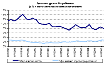С конца 1998 г., после того как фактический уровень безработицы достиг своего "естественного" значения, процесс высвобождения работников начал способствовать реструктуризации и оптимизации занятости в стране, что привело к возникновению ярко выраженной тенденции к снижению уровня естественной безработицы (в середине 2004 г. он равнялся 7,2%) /№8, стр.87/.