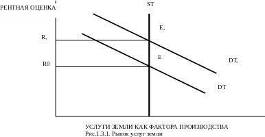 На рис.1.3.1 изображен рынок услуг (или использования) земли. Предложение земли, а значит, и предложение услуг земли характеризуется совершенной неэластичностью, так что кривая предложения вертикальна. Кривая спроса DT показывает производный спрос на услуги земли. Расположение и форма кривой зависят от технологий в отраслях, использующих землю, количества других применяемых ими факторов производства, а также от спроса на производимую ими продукцию.