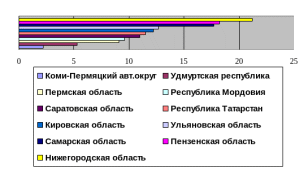 Рисунок 2. Доля занятых на предприятиях в общей среднесписочной численности занятых по регионам ПФО (%) (2006г.).
