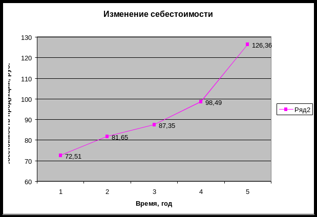 4. Абсолютный прирост показывает, что в наш период в среднем происходило увеличение величины себестоимости производства колбасы «Московская» на -13,46 руб. в год.