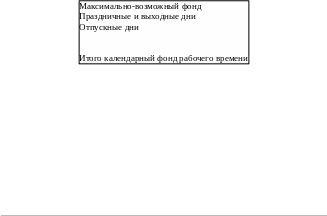 Если из календарного фонда рабочего времени исключить неявки в выходные и праздничные дни и в связи с очередными отпусками, то получится максимально возможный фонд рабочего времени.