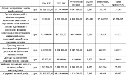 Таблиця 3.1 - Структура та динаміка формування валових доходів підприємства в 2004 -2005 роках