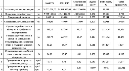 Таблиця 3.3 - Структура та динаміка продуктивності праці та заробітної плати на підприємстві в 2004-2005 роках