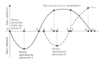 Для сохранения уровня прибыли на предприятии важно определить момент начала проектирования и запуска в производство новой продукции. Дело в том, что этап проектирования и освоения продукции занимает определенное время, в течение которого предприятие несет убытки (0; t1). Затем с момента запуска продукции в производство (t1) убытки начинают снижаться и через некоторое время достигается точка безубыточности (t2). При увеличении объема продаж растет и прибыль за счет снижения доли постоянных расходов (t2; t4). При достижении равновесия спроса и предложения размер прибыли стабилизируется и некоторое время остается на неизменном уровне (t4; t7). Такое положение может сохраняться довольно длительное время при отсутствии угрозы со стороны конкурентов и при стабильном спросе на продукцию. При наличии конкурентов поддержание уровня продаж достигается путем снижения рентабельности, т.е. понижения цены за счет доли прибыли. Эффективность начинает снижаться (t7; t9).