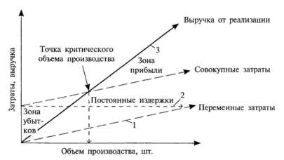 Точка критического объема производства показывает объем производства, при котором выручка от реализации равна ее полной себестоимости.