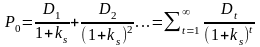 Еще одним методом позволяющим определить стоимость акции является метод дисконтирования дивидендов. Стоимость акции определяется как настоящая стоимость денежного потока, и простейшая оценка акций очень похожа на оценку облигаций. Если представить гипотетическую ситуацию, в которой инвестор покупает акцию с намерением держать ее вечно, то есть после своей смерти завещать детям, внукам и т.д. В этом случае, инвестор и его наследники получат поток дивидендов, и стоимость акции может быть рассчитана как настоящая стоимость бесконечного потока дивидендов.