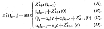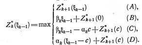 При составлении модели ДП мы рассматриваем процесс замены как n-шаговый, разбив весь плановый период на п промежутков. Так как в начале каждого из этих промежутков принимается решение либо о сохранении оборудования, либо о его замене, то управление на k-м шаге (k=l, ..., п) содержит всего лишь две альтернативные переменные. Обозначим через ис решение, состоящее в сохранении старого оборудования, а через и3 — решение, состоящее в замене старого оборудования новым. Функциональные уравнения, благодаря наличию двух альтернативных управлений на каждом шаге, содержат лишь две величины: одна выражает условную прибыль (условные затраты) при управлении uс, другая — тот же показатель при управлении из. Условная оптимизация на каждом шаге состоит в вычислении двух величин и в выборе из них наибольшей (наименьшей). Это значительно упрощает расчеты на стадии условной оптимизации и позволяет решать вручную задачи о замене с большим числом шагов.