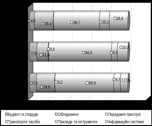 У структурі найбільша питома вага належить транспортним засобам від 47% до 64%, що відповідає специфіці діяльності. Структуру ілюструє діаграма, надана на рисунку 1.