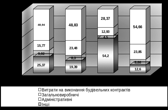| Стаття витрат | Витрати на виконання будівельних контрактів | Загально-виробничі | Адміністративні | Інші | Всього |