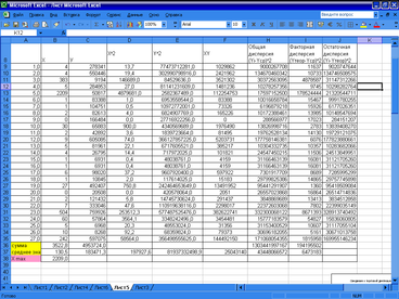 | Количество | сумма | X^2 | Y^2 | XY | Yтеор= a+b хi | Общая дисперсия (Yi-Yср)^2 | Факторная дисперсия (Yтеор-Yср)^2 | Остаточная дисперсия (Yi-Yтеор)^2 |