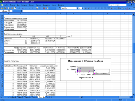 В нашем случае уравнение регрессии имеет вид Y = 1826747+6,1Х. При этом коэффициент а1 показывает, что с возрастание количества проданного товара на 1 единицу приведет к увеличению суммы проданных товаров на 6,1 руб.