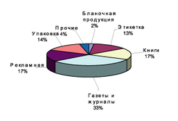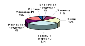 Наибольшая доля — 32% по состоянию на конец 2004 года — в объемах потребления полиграфической продукции в РФ, принадлежит газетам и журналам. В структуре потребления продукции преобладает потребление газет и журналов. Несколько меньшая доля приходится на книжную продукцию — 19%. Доля упаковки в общем объеме потребления составила 16%, 14% — доля рекламной продукции. Этикетка занимает 11%, на бланочную продукцию приходится 4%, на прочие виды — 4%.