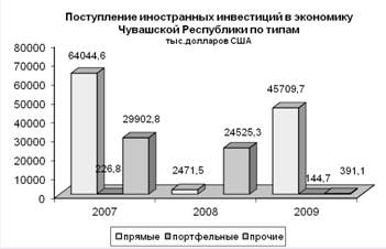 В 2010 году темп роста иностранных инвестиций, поступивших в организации Чувашской Республики составил 171,3 %. В организации республики от иностранных инвесторов поступило инвестиций на сумму 46245,5 тыс.долларов США, в том числе прямые - 45709,7 тыс.долларов США, портфельные 144,7 тыс.долларов США, прочие инвестиции – 391,1 тыс.долларов США.