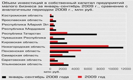 Приволжский федеральный округ (далее - ПФО), в который входит Чувашская республика, выделяется среди других округов постоянным уменьшением инвестиционного потенциала при небольшом снижении инвестиционного риска, а также значительной межрегиональной дифференциацией инвестиционного климата. При этом, за последние пять лет Чувашская республика занимает твердые позиции по росту инвестиций в ПФО, но в послекризисный период (с лета 2010 года) демонстрирует динамику увеличения практически всех частных инвестиционных рисков. В этом мы можем убедиться, рассмотрев график на рисунке 9. На примере малых предприятий видно, что только Чувашские малые компании снизили инвестиции в собственное развитие.
