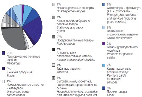 К основным товарным категориям, реализуемым через сеть отделений почтовой связи, относятся не требующие особых условий хранения товары повседневного спроса (продовольственные товары, табачные изделия, товары бытовой химии и средства гигиены, текстильные и трикотажные товары и др.), товары, не относящиеся к таковым, но ставшие традиционными для Почты (периодические печатные издания, конверты, открытки, календари), а также карты предоплаты различных услуг, фототовары и т.д.