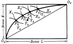Любая точка в коробке представляет размещение обоих ресурсов между производством Х и Y. Местоположение парето-эффективных способов размещения K и L представлено точками (P1,...,P4) касания изоквант производства X (X1,...,X4) и изоквант производства Y (Y4,...,Y1). Множество всех таких точек касания образует линию OXOY, аналогичную контрактной кривой. Во всех точках линии OXOY предельные нормы замены для обоих продуктов равны.
