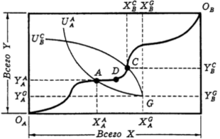Множество этих точек составляет контрактную кривую - на рис. 3 это линия, соединяющая точки ОA и ОB. Поскольку каждое размещение на этой кривой парето-эффективно, при перемещении по контрактной кривой увеличение полезности одного индивида достигается только за счет уменьшения полезности другого. Поэтому контрактную кривую называют также конкурентной.
