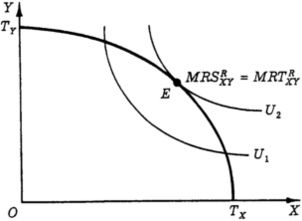 Парето-эффективность в производстве и обмене предполагает такой выбор структуры продукции, когда предельная норма замены для любых двух благ (нормы замены равны для всех индивидов, если имеет место парето-эффективность в обмене) равна предельной норме трансформации этих двух благ (нормы трансформации равны для всех фирм, если имеет место парето-эффективность в производстве). Для варианта с двумя индивидами (А и В) и двумя благами (Х и Y) это можно формально записать следующим образом: