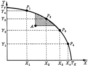 Предполагается, что граница производственных возможностей вогнута к началу координат. Это означает, что при увеличении выпуска блага X (и соответствующем уменьшении выпуска блага Y) предельная норма трансформации MRTXY возрастает: для увеличения выпуска X на единицу приходится жертвовать все большими количествами Y.