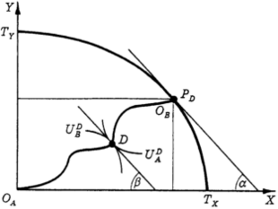 Рис. 7. Эффективность структуры продукции. Угловые коэффициенты: α = MRTXY = MCX / MCY; α = MRSAXY = MRSBXY = (MUX/ MUY)A / (MUX/ MUY)B.