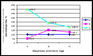 Как видно из рис. 2 темпы роста продукции вида А стабильны, рост производства продукции вида В уменьшился во 2 квартале, увеличился в 3 квартале и немного замедлился в 4 квартале отчетного года, объемы производства продукции вида С были резко увеличены во 2 квартале, а в 3 и 4 кварталах начали падать.