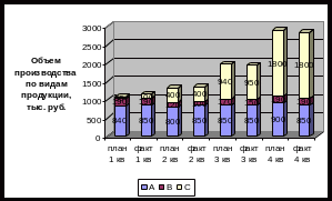 Из рис.1 видно, что выпуск продукции вида А занимает стабильное положение в производстве, выпуск продукции вида В был уменьшен во 2 квартале и восстановился в 3 и 4 кварталах. Выпуск продукции вида С увеличивается в течении отчетного года, в связи с чем увеличивается и объем производства.