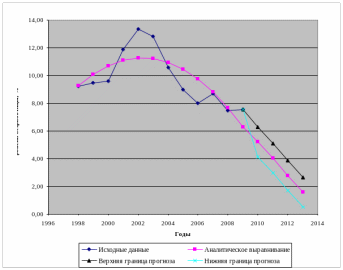В данном разделе на основе проведенного анализа динамических рядов и корреляционно-регрессионного анализа рассчитаем прогнозные значения уровня безработицы на последующие 4 года, т.е. на 2009, 2010, 2011 и 2012 годы.