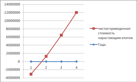 Затем определяется текущая прибыль, дисконтированная текущая прибыль, дисконтированные инвестиционные затраты и чистый дисконтированный доход, по которому можно определить чистый дисконтированный доход нарастающим итогом.