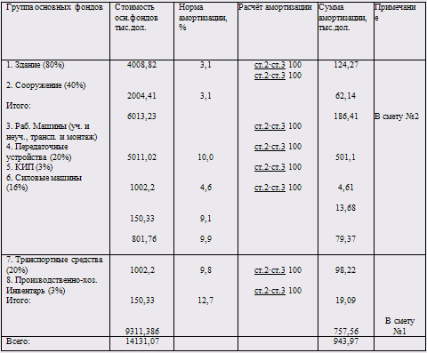 2. Расчёт сметной стоимости строительства цеха (отдела) и годовой суммы основных фондов приведен в таблице 8.