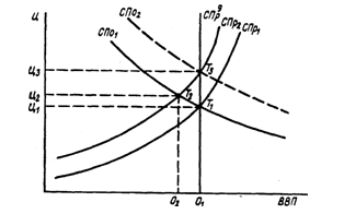 Якщо припустити, що при незмінній сукупній пропозиції (СПр1 сукупний попит зменшиться порівняно з потенційною величиною (СПо1, а його крива переміститься вліво в положення СПо2 то короткострокова рівновага буде забезпечуватися в точці Т2 що порушує довгострокову рівновагу. Якщо, навпаки, при незмінному сукупному попиті (СПо1) короткострокова сукупна пропозиція зменшиться відносно потенційної величини (СПр1), a u крива переміститься в положення СПр2 то короткострокова рівновага буде забезпечена в точці Т, L теж порушить довгострокову рівновагу[19].