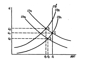 Згідно з мал. 3, початкова рівновага в економіці досягається в точці T1, якій відповідає рівноважний ВВП (О1) на потенційному рівні, і рівноважні ціни (Ц1), а також певний рівень зарплати в умовах природного рівня безробіття.
