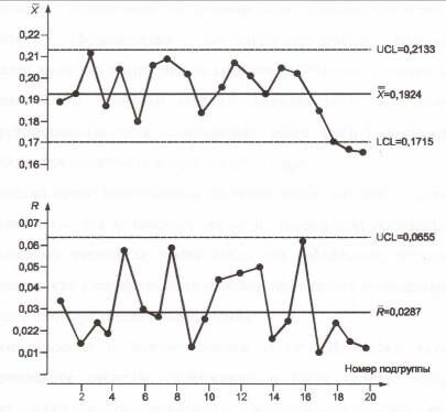 карты показывает, что последние три точки вышли за границы. Это указывает на возможность действия некоторых особых причин вариаций. Если пределы были вычислены на основе предыдущих данных, то должно быть предпринято действие в точке, соответствующей 18-й подгруппе.