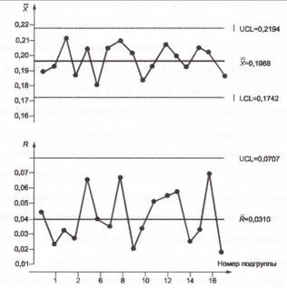В табл. 6 приведены результаты измерений внешнего радиуса втулки. Каждые полчаса делалось четыре измерения, всего взято 20 выборок. Средние и размахи подгрупп также приведены в табл. 5. Установлены предельно допустимые значения внешнего радиуса: 0,219 и 0,125 дм. Цель – определение показателей процесса и управление им по настройки и разбросу так, чтобы он соответствовал установленным требованиям.