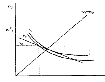 Полезность работника увеличивается в северо-восточном направлении, а прибыль фирмы увеличивается в юго-западном направлении, поэтому все контракты, расположенные внутри площади, ограниченной 0 и v(0), являются, с точки зрения Парето-эффективности лучшими по отношению к 0. Эффективные по Парето контракты должны лежать на линии определенности работника, где w1 = w2. Только на линии определенности линия изоприбыли фирмы будет касательной к кривой безразличия полезности работника.