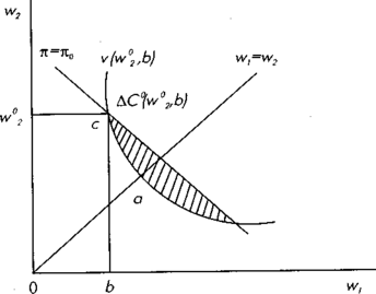 Поскольку эффект пропорциональности одинаков для каждой кривой, точка касания остается на линии определенности работника, где w1 = w2. Таким образом, вероятность безработицы не меняет жесткости заработной платы. Для любого >0 любой контракт вне линии определенности является худшим по сравнению с тем, который лежит на линии определенности.