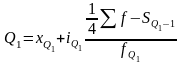 Следовательно, кроме медианы, в ряду распределения имеются три квартиля и девять децилей. Медиана одновременно является вторым квартилем и пятым децилем. Расчет первого (Q1) и третьего (Q3) квартилей аналогичен расчету медианы, только вместо медианного интервала берется для первого квартиля интервал, в котором находится варианта, отсекающая ¼ численности частот, а для третьего квартиля - ¾ численности частот: