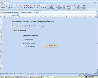 На рисунку 3.1.1 вказані показники і фактори економіко-математичні моделі за допомогою яких буде відбуватися прогнозування. Кнопка "Початкові дані" дозволяє перейти у наступне вікно програми для введення вхідної статистики.