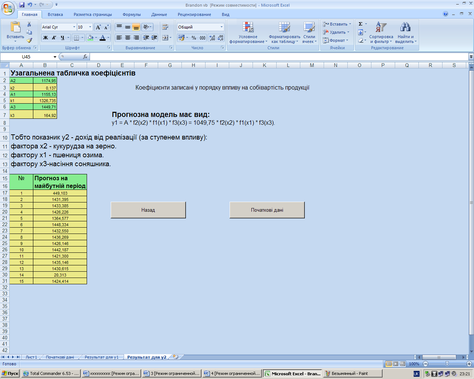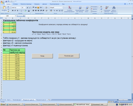 При натисканні на кнопку "Прогноз для Y1" ми переходимо до вікна в якому відображень результат розрахунків для Y1 - валова продукція по собівартості за рік. (рисунок 3.1.4)