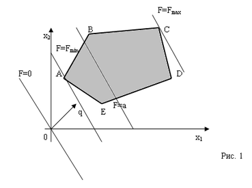 Пусть геометрическим изображением системы ограничений является многоугольник ABCDE (рис. 1). Необходимо среди точек этого многоугольника найти такую точку, в которой линейная функция F=c1x1+c2x2 принимает максимальное (или минимальное) значение.