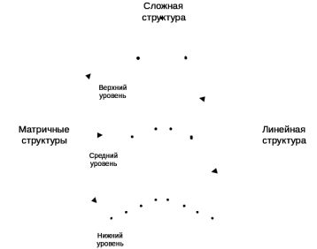 Под сложной структурой понимается многопараметрическая матричная организация, отдельные звенья которой упорядочены по принципу иерархии. Система сочетает достоинства как линейной, так и матричной организации. На рис. 1 представлена графическая интерпретация проектирования сложной организационной структуры, включающую среди своих элементов также матричную и линейную структуру.