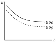 которое и отражает факт роста производства во времени при фиксированных затратах труда и капитала. Геометрическая иллюстрация такого процесса дана на рис. 4.13, где показано, что изокванта, соответствующая выпуску продукции в объеме Q , смещается с течением времени ( t 2 > t 1 ) вниз и налево.